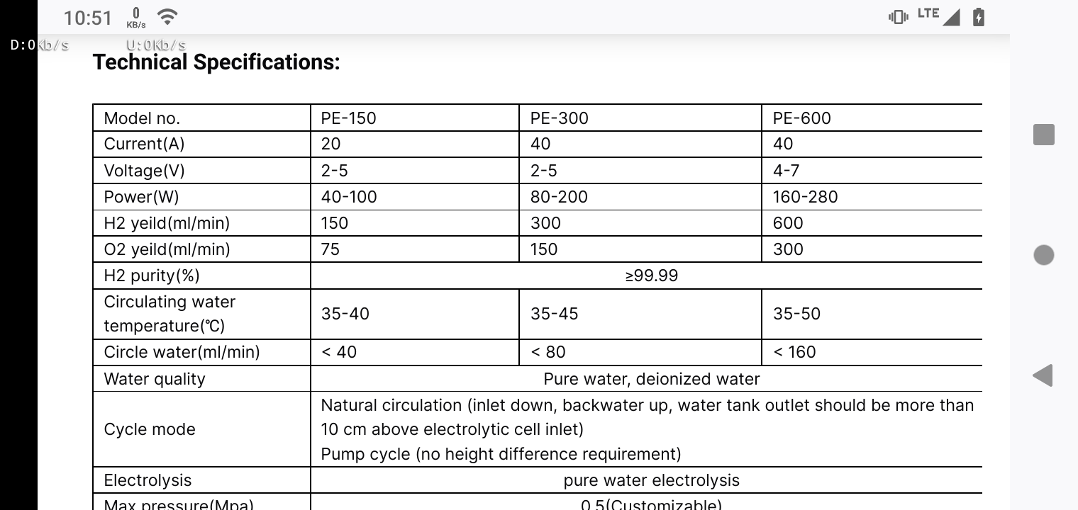 The pic which shows "Technical Specifications" is not related to this item but is technical normalities taken from the web that illustrate these issues. Notice to produce 600 ml per millimeters at 7 volts, 40 watts is consumed and generates 50 degrees centigrade "circulating". ( approximately 122 degrees F) Notice the more gas produced, the more volts and amps it takes as required.